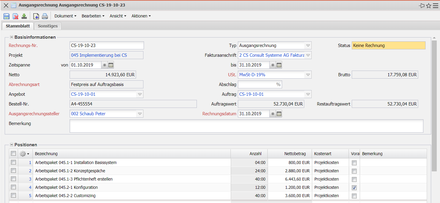 Die Maske Rechnung realisiert die Rechnungsstellung im System. Die (Ausgangs-)Rechnung beinhaltet u.a. Informationen über Rechnungsbezeichnung, Projekt, Ersteller, Status der Rechnung, Leistungsintervall, Nettobetrag, Umsatzsteuer, Gesamtbetrag, Skonto, Abrechnungsart und Rechnungsdatum.