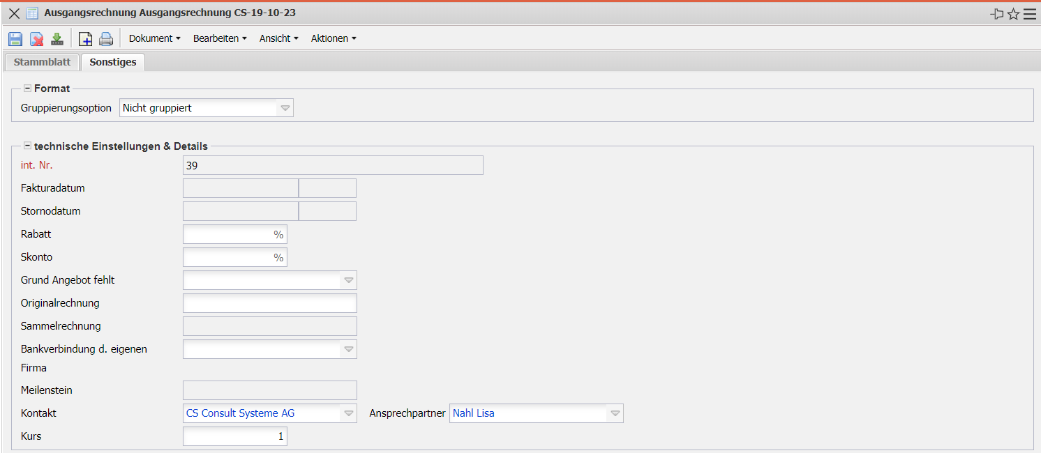 - Sammelrechnung: Dieses Feld enthält bei Sammelrechnungen einen entsprechenden Verweis auf die Sammelrechnung (nicht in der Standardversion enthalten).