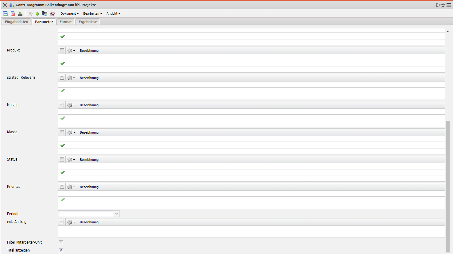 - Produkt, Strategie, Nutzen, Klasse: In diesen Auswahlboxen können als Selektionskritierium Produkt, Strategie, Nutzen und Klasse gewählt werden. Diese Selektionen beziehen sich jeweils auf die gleichnamigen Felder im Projekt.