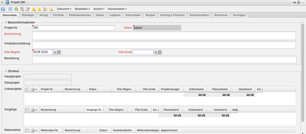 Bei Auswahl der manuellen Projekterzeugung öffnet sich eine neue Maske vom Typ Projekt mit den Vorbelegungen.