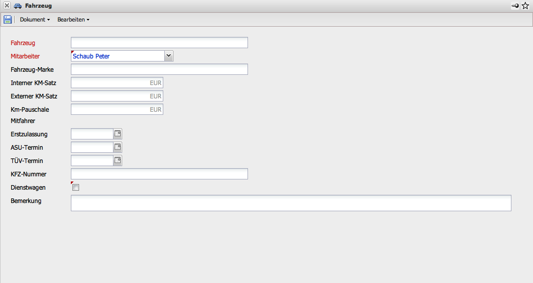 Mit Hilfe der “Anlegen”-Funktion können neue Datensätze im System angelegt werden. Nach Auswahl einer Datensatzart (hier Fahrzeug) öffnet sich …