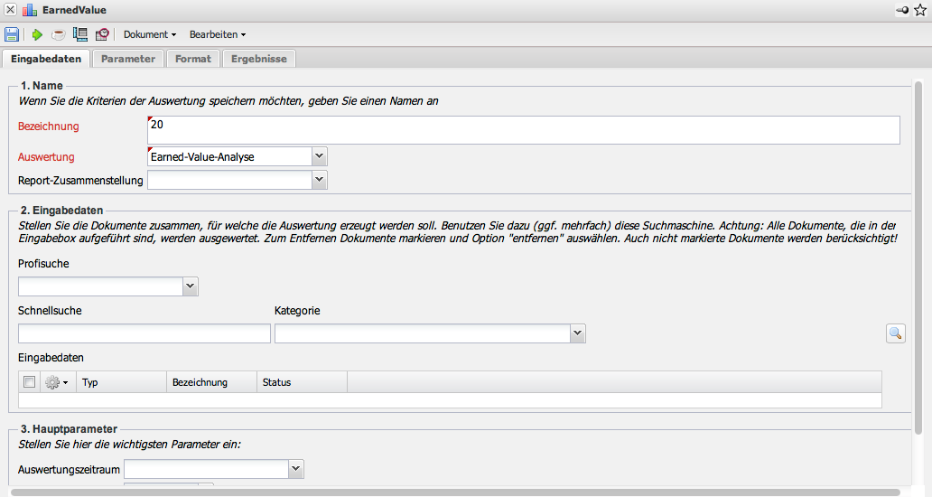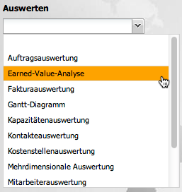 Nach Auswahl einer Auswertungsart (hier EarnedValue) öffnet sich …