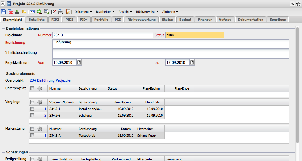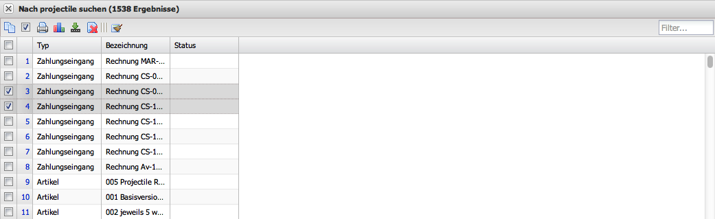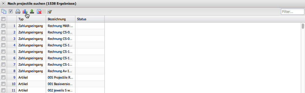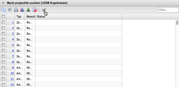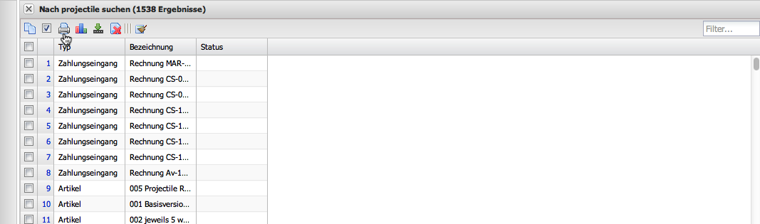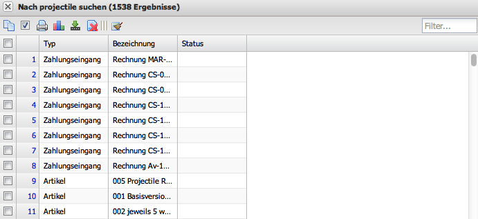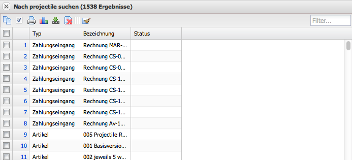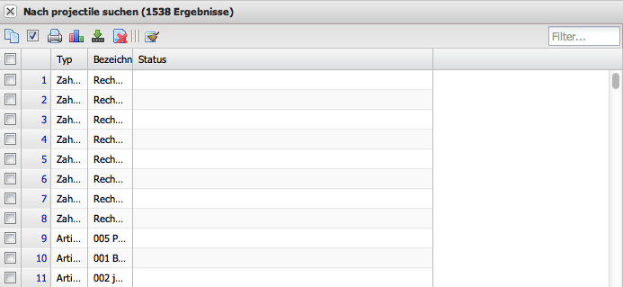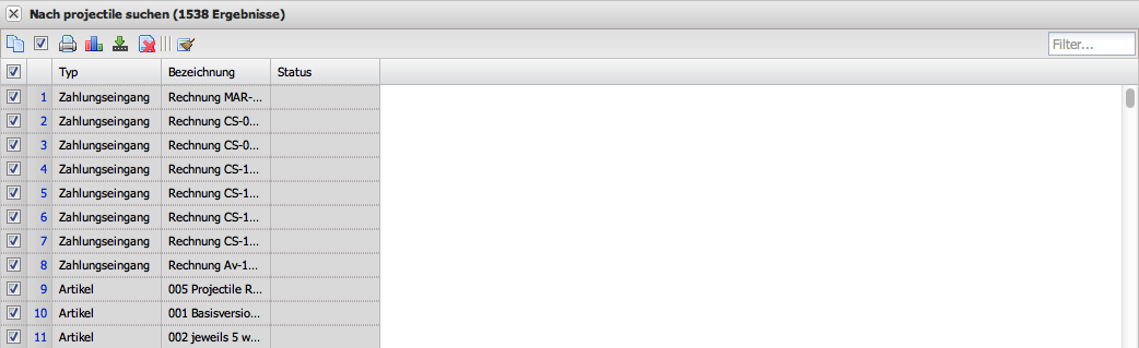 Die Suchmaschine dient zum Auffinden von Daten. Durch Eingabe eines Suchstrings im Feld Schnellsuche (hier Projectile) und Mausklick auf den Button “Suchen”, kann der komplette Datenbestand nach diesem String durchsucht werden.