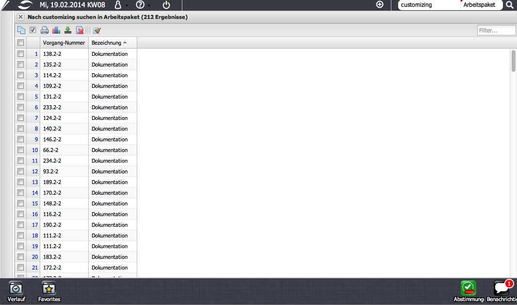 … und in der Trefferliste werden nun alle Arbeitspakete angezeigt, die den Begriff Customizing enthalten. Dabei spielt es keine Rolle, ob dieser String in der Bezeichnung steht oder in einem anderen Element des Dokumentes.