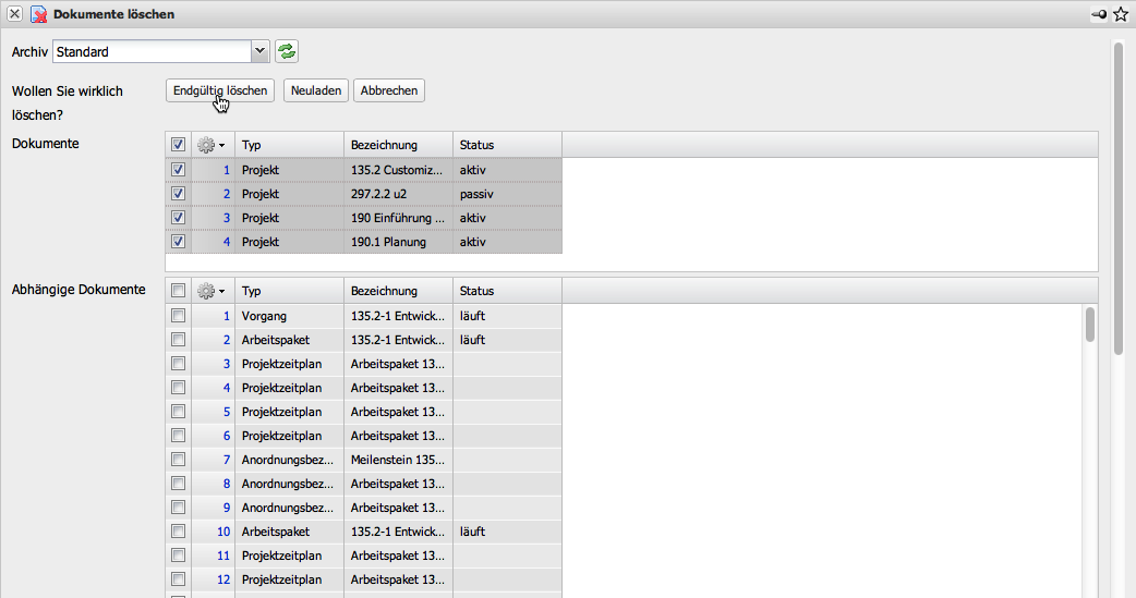Das zweite Beispiel zur Nutzung der Dokumentensuche zeigt die Möglichkeit, innerhalb eines Dokumenttyps (Kategorie) nach einem bestimmten String zu suchen, die Suche also weiter einzuschränken: Im Beispiel möchte der Benutzer alle Dokumente des Typs Arbeitspaket auflisten, in denen der String “Customizing” vorkommt …