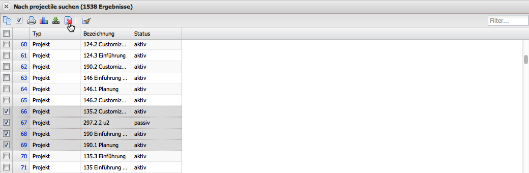 Markierte Trefferlistenergebnisse sind durch das Löschen-Symbol in der Toolbar entfernbar.