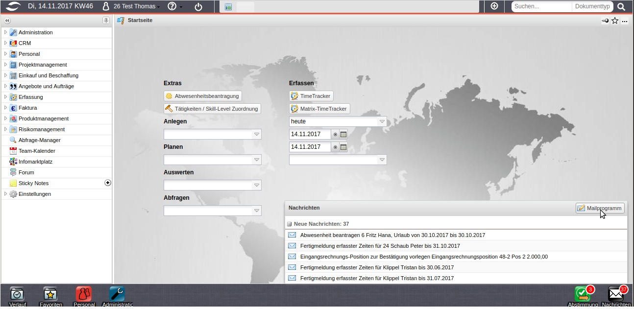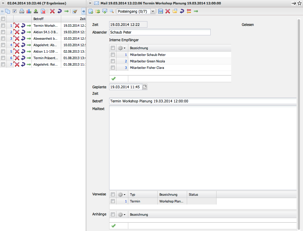 Projectile beinhaltet im optionalen Groupware-Modul eine interne und externe Mailfunktionalität. Mit Hilfe des integrierten Mailsystems “Mailer” können systemweit Mails und Kurznachrichten (SMS) versendet werden. Die internen Mails können direkt auf beliebige Dokumente im System verweisen und automatische Nachrichten für Wiedervorlagen (siehe auch Kontaktsystem) oder Erinnerungen an Termine (siehe auch Team-Kalender) erzeugen. Darüber hinaus ist das Mailsystem im Kontaktsystem und der Mitarbeiterverwaltung integriert.