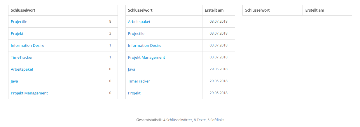 Die Begriffe auf der rechten Seite (Information Desire, Arbeitspaket, Projekt Management etc.) sind sogenannte SoftLinks und kennzeichnen Informationen, die vom aktuellen Eintrag heraus aufgerufen worden sind. Wie im menschlichen Gehirn werden häufig benutzte Verknüpfungen in der Auflistung stärker hervorgehoben.