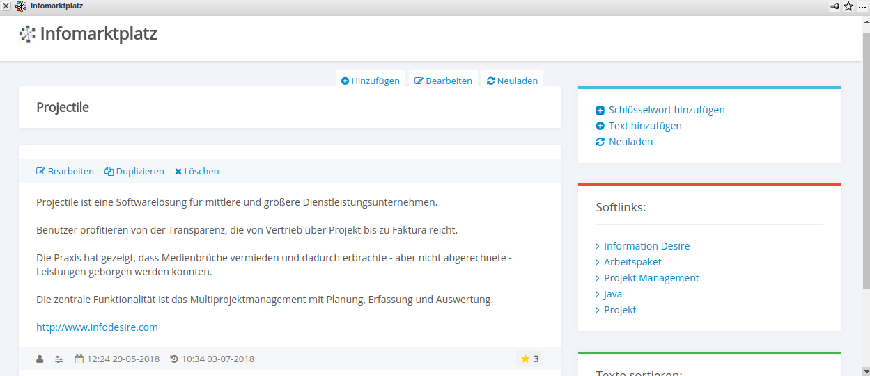 Das optionale Modul Infomarktplatz ist eine Funktionalität, die als webbasiertes Informationssystem für das Wissensmanagement eingesetzt werden kann. Jeder Benutzer nimmt an der Pflege der Informationen bzw. Beiträge im Infomarktplatz teil. Im normalen Betrieb braucht das System also keinen Moderations- oder Redaktionsaufwand.