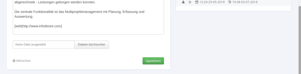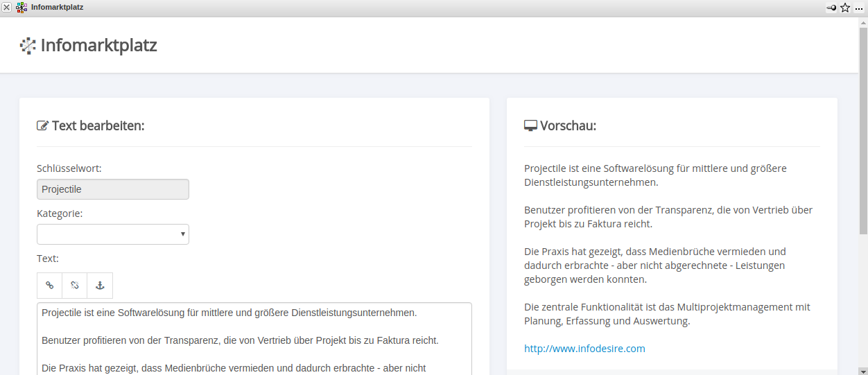 Im Beispiel ist das Wort „TimeTracker“ ein HardLink, der entweder auf einen anderen Eintrag im Infomarktplatz hinweist oder einen anderen Benutzer auffordert Informationen zu diesem Eintrag beizusteuern. Die URL (www.infodesire.com) oder z.B. die möglichen Verweise auf dem Thema entsprechende Projectile-Masken sind ebenfalls HardLinks, referenzieren allerdings nicht auf direkte Informationen im Infomarktplatz, sondern auf eine Homepage und beispielsweise zwei Projektdokumente im System.