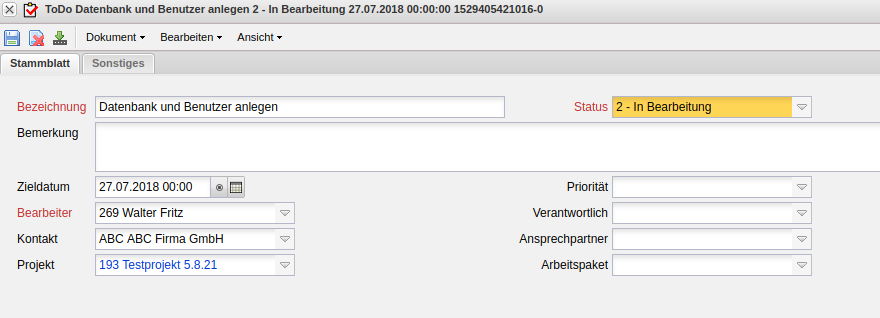 Die Maske To-Do beinhaltet Informationen über den Bearbeitungsstatus, Datum, Mitarbeiter, Kontaktdaten und das zugeordnete Arbeitspaket. Die To-Dos werden überwiegend Arbeitspaketen zugeordnet und dann als Checkliste verwendet.