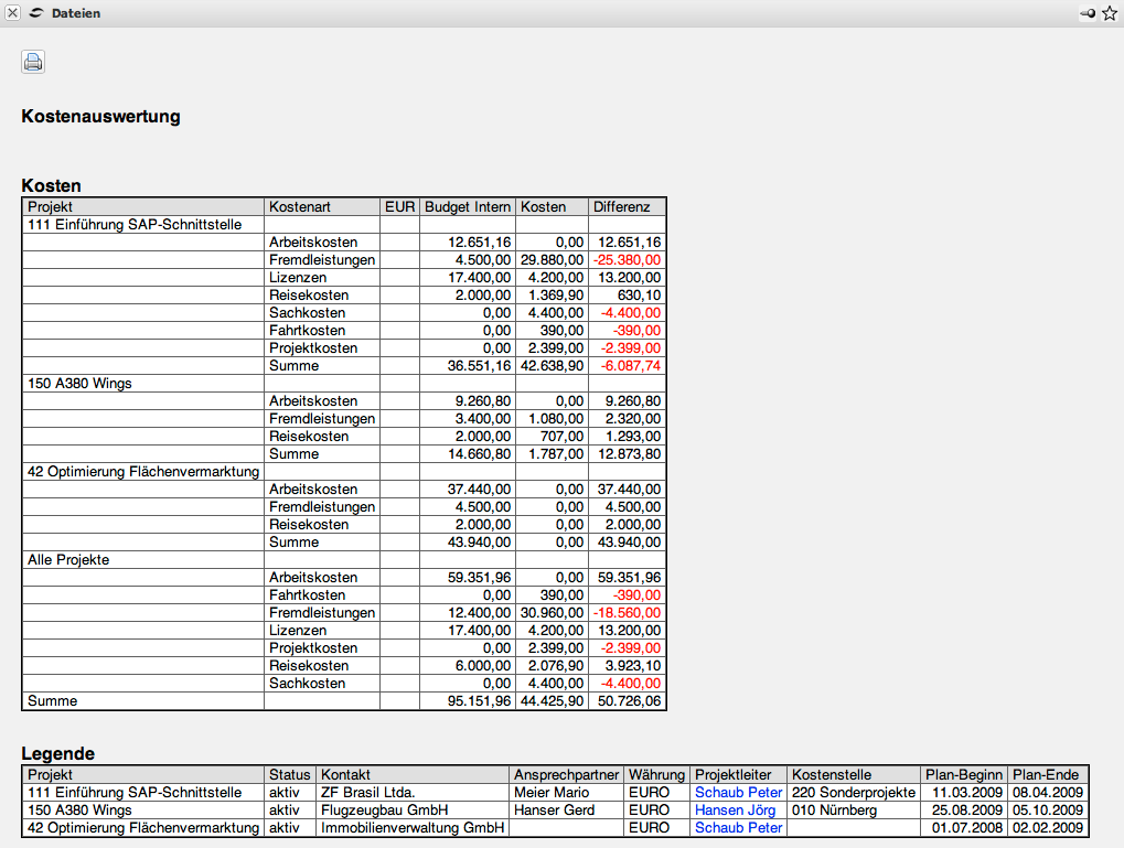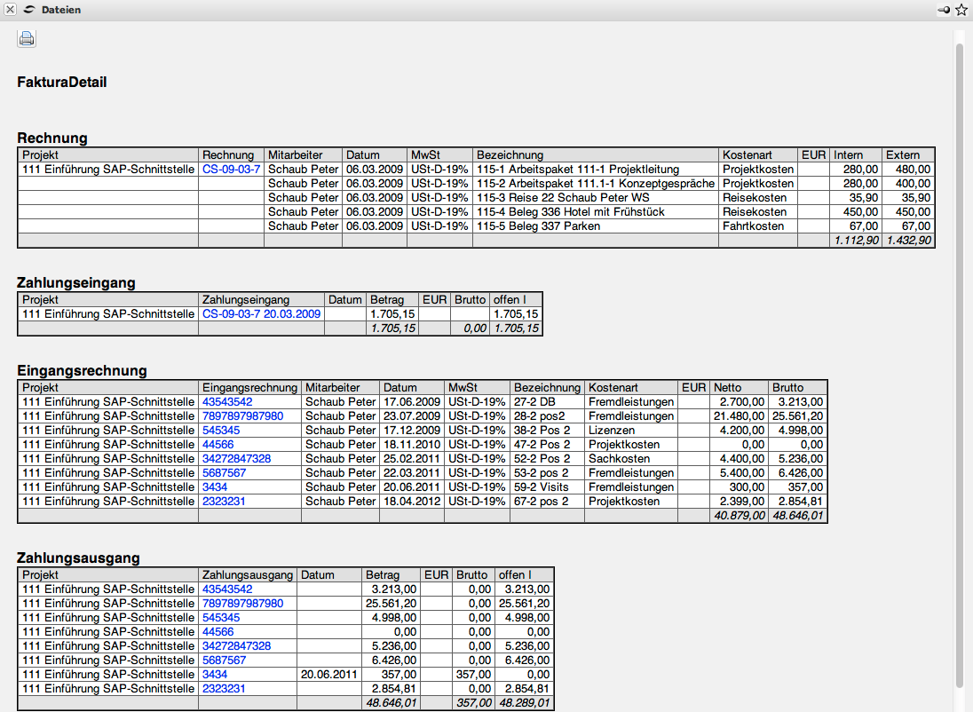 Kostendaten: Hier werden aus der Zeit- und Kostenerfassung die direkten Kosten (Reisekosten, Fahrtkosten, Belegkosten und Fremdkosten) und die Fremdrechnungen inklusive Zahlungsausgänge und evtl. die offenen Verbindlichkeiten aufgeführt.