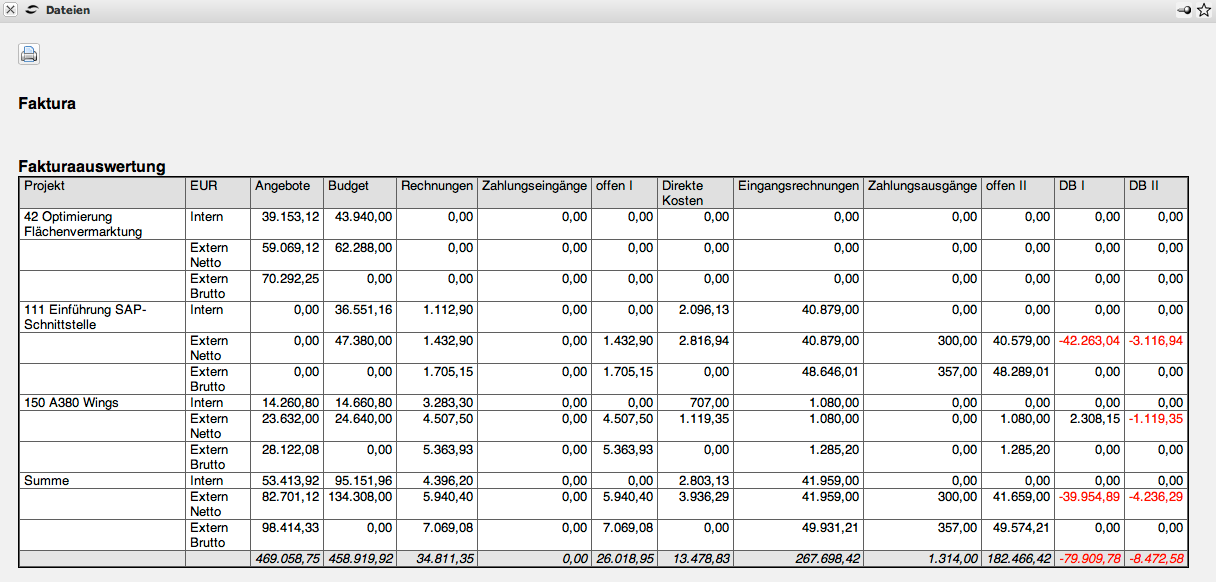 Fakturadaten: Hier werden die Angebotswerte (Extern Netto/Extern Brutto) und der interne Angebotswert (Angebot basiert auf diesen internen Kosten), die internen und externen Budgets (aus den Arbeitspaketen und der Budgetverwaltung), die Rechnungsbeträge (Extern Netto/Extern Brutto) und der interne Rechnungswert (fakturierbare Leistungen) sowie die Zahlungseingänge und offene Forderungen aufgelistet.