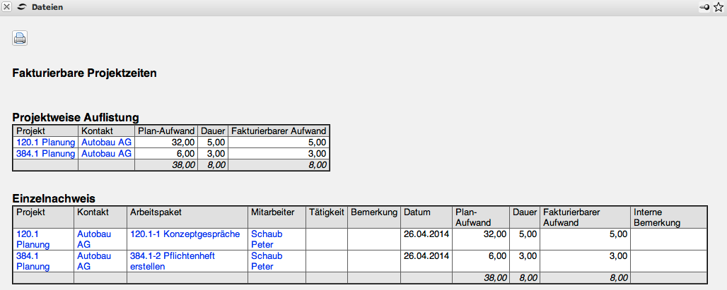 Die Auswertung Fakturierbare Projektzeiten erzeugt eine detaillierte Übersicht über alle erfassten und fakturierbaren Zeiten. Die Istaufwände kommen dabei direkt aus dem TimeTracker, die Werte für die fakturierbaren Dauern entweder aus dem TimeTracker (wenn die entsprechende Option aktiv ist) oder aus der Funktionalität “Fakturierbare Zeiten”. Diese Variante listet die Projektzeiten projektweise auf und führt im unteren Teil die Einzelzeitnachweise mit den Bemerkungen auf.