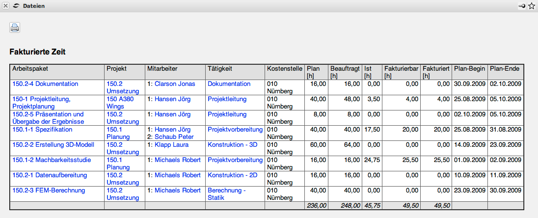 Die Auswertung Fakturierte Zeit erzeugt eine detaillierte Übersicht über alle geplanten, beauftragten, erbrachten, fakturierbaren und bereits fakturierten Projektleistungen auf Basis der erfassten und abgerechneten Zeiten. Diese Auswertung basiert auf den Arbeitspaketen und bestimmt die Planzeiten direkt aus den Aufgaben, die Ist-Zeiten aus der Leistungserfassung (TimeTracker) und die fakturierten Zeiten aus den Rechnungsdaten.