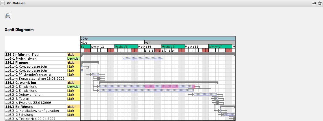 Dieser Auswertungsblock beinhaltet das Gantt-Diagramm (Balkenplan) und die Auswertung Gantt-Tabelle, die als Ergänzung zum Diagramm gedacht bist. Ein Balkenplan ist ein Diagramm zur Visualisierung der Zeitplanung eines Projektes. Die Dauer eines Arbeitspakets oder Projektes wird durch die Länge des Balkens in der Zeitachse symbolisiert. Die Balken können sowohl Ist- als auch Soll-Daten umfassen. Ereignisse oder Meilensteine werden als Zeitpunkte dargestellt. In Projectile werden Abläufe in der Projektauswertung visualisiert.