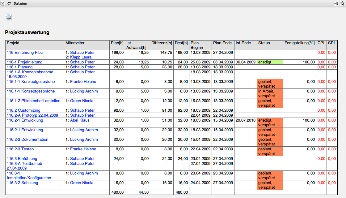 Diese Auswertung liefert eine Übersicht über alle Elemente des Projektstrukturplans und der Meilensteine der selektierten Projekte. Die Plan-, Ist- und Restaufwände für die Elemente werden zusammen mit Termin- und Kosteninformationen sowie Kennzahlen in einer Liste dargestellt. Dabei werden die Plandaten aus den Arbeitspaketen bestimmt und die Ist-Zeiten werden aus den Erfassungsdaten des TimeTrackers gewonnen.