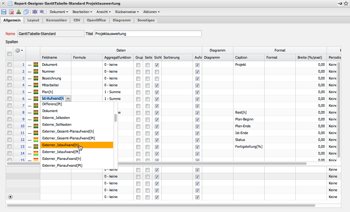 Diese Auswertung unterstützt über 60 Kennzahlen. Diese Kennzahlen können im ReportDesigner zugeladen werden.