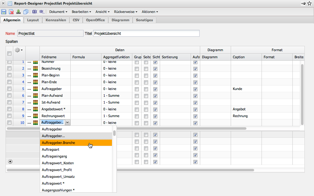 erzeugt. In der Auswahlliste “Feldname”, können je nach Dokumenttyp, referenzierte Elemente verfügbar sein. Im Beispiel für den Projektreport ist der Dokumenttyp Projekt ausgewählt. Innerhalb des Dokumentes gibt es das Element Auftraggeber, das aus dem Kontaktsystem herangezogen wird. Diese Verknüpfungen sind auch im ReportMaker nutzbar. Wenn ein Feld innerhalb der Auswahlbox “…” enthält, können mit Hilfe der Funktionalität