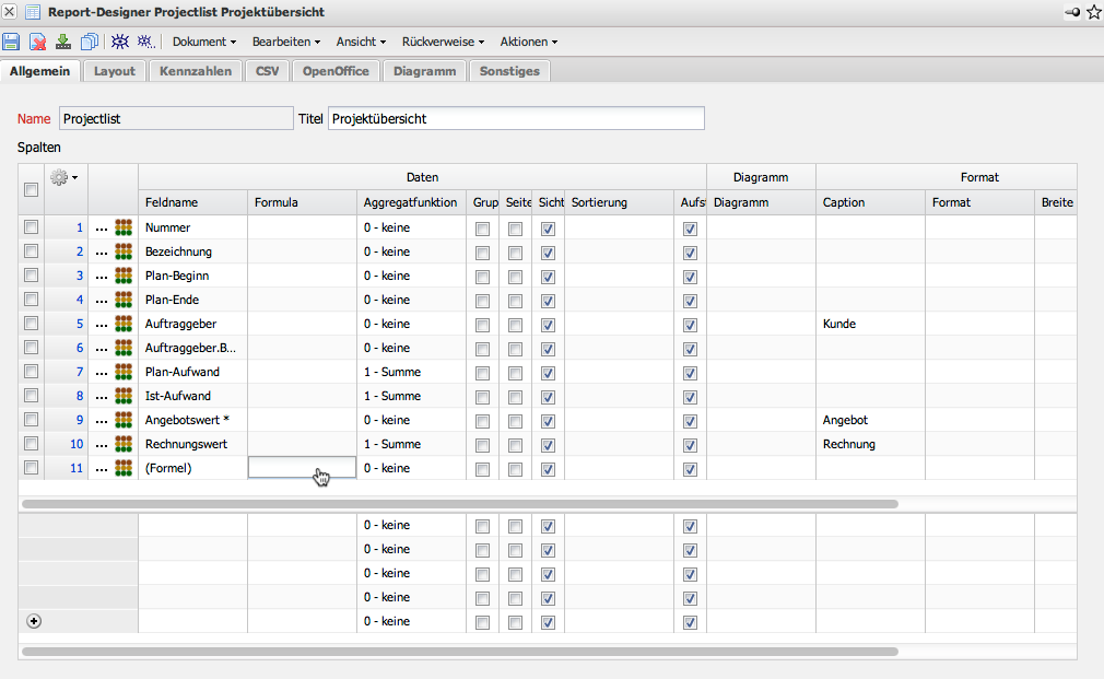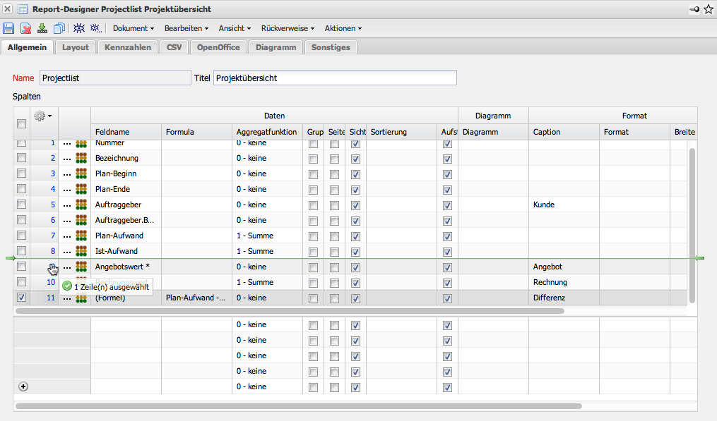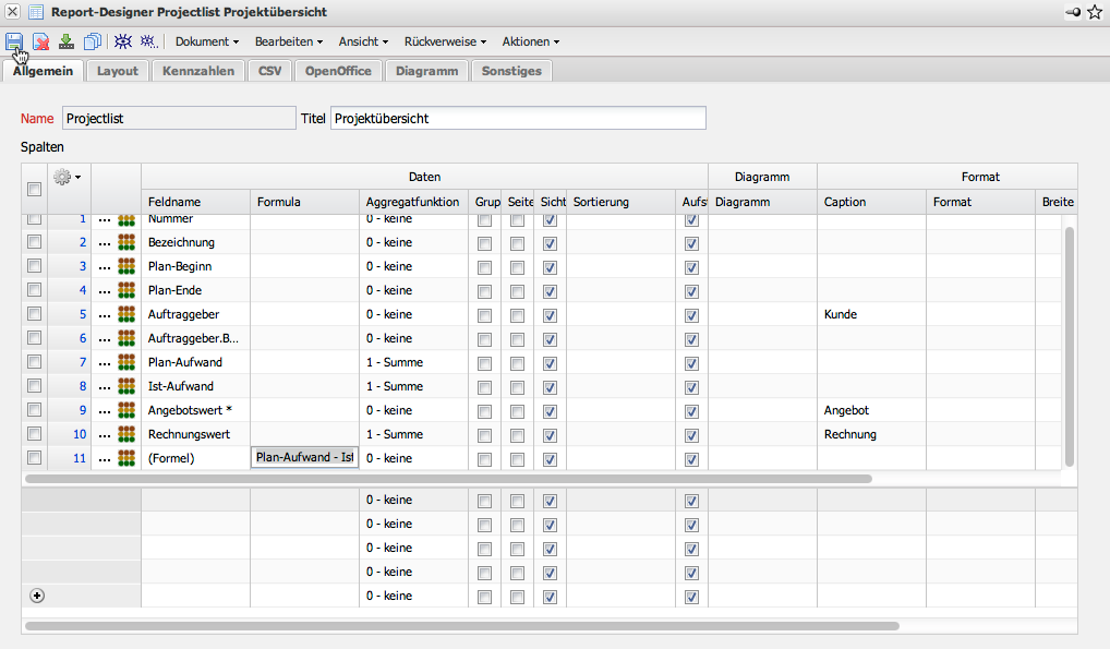 Innerhalb der Formel können alle Grundrechenarten (+,-,*,/) verwendet werden. Bei der Definition der Formeln muss aber stets auf die richtige Schreibweise (auch Groß-/Kleinschreibung) geachtet werden. Im Beispiel soll ein neues Feld mit dem Namen “Differenz” erzeugt werden, das aus den Feldern Plan-Aufwand - Ist-Aufwand berechnet und summiert werden soll (Aggregatsfunktion).
