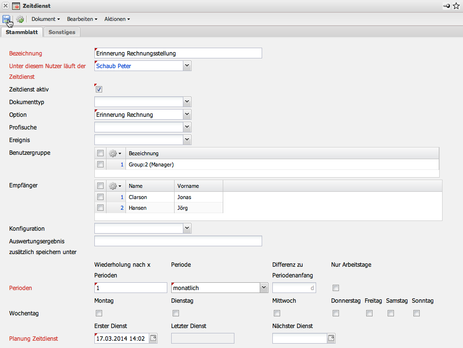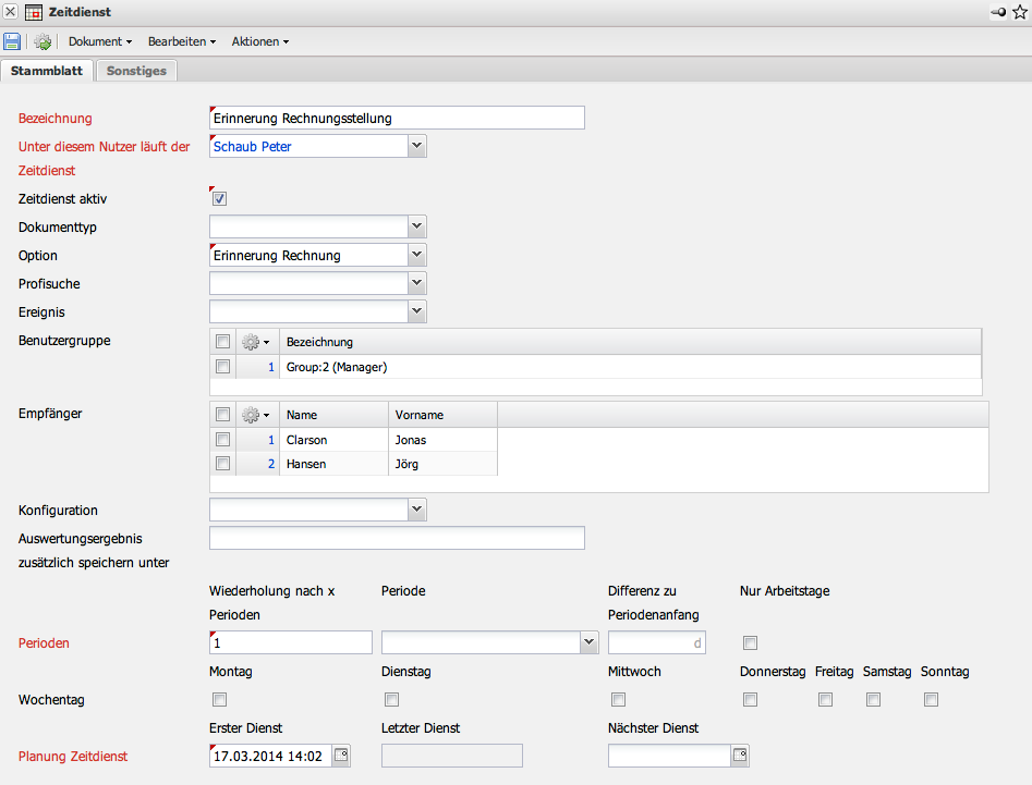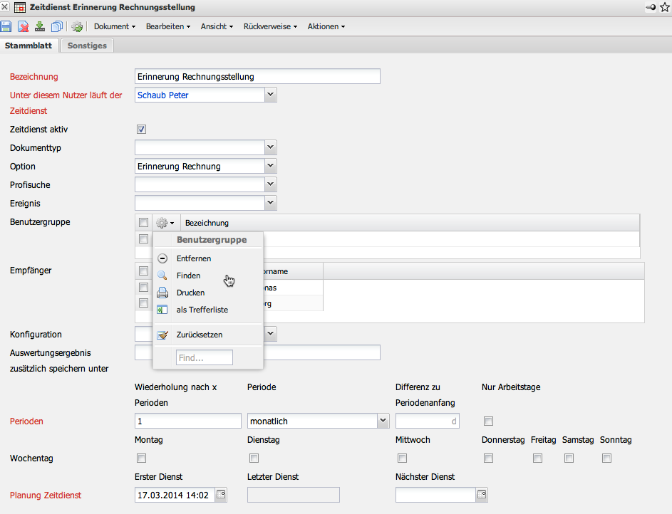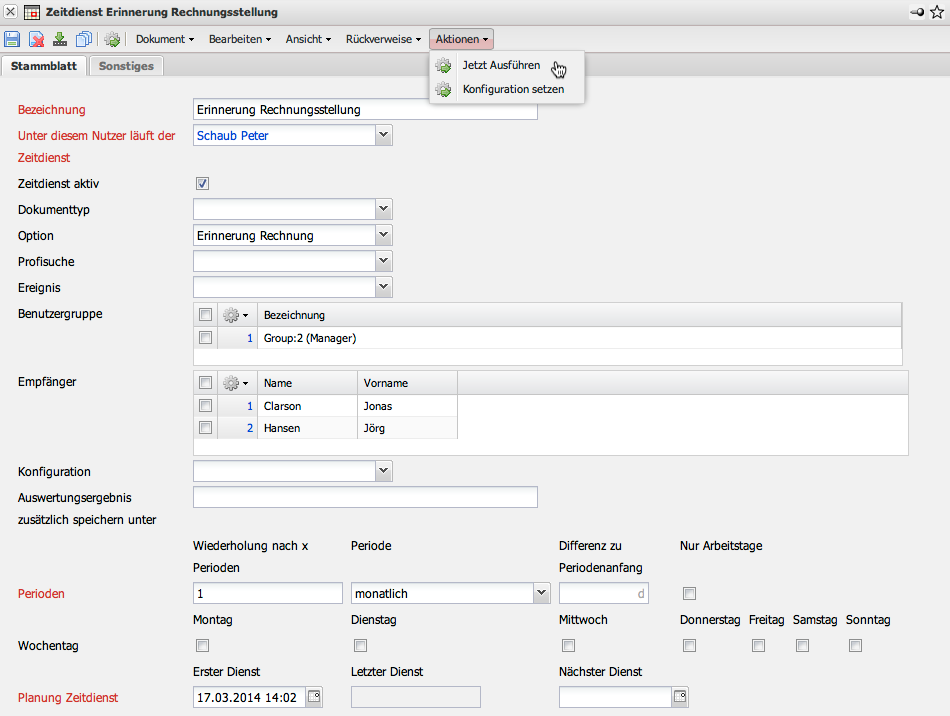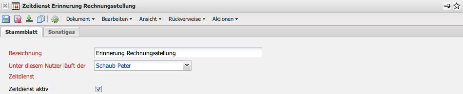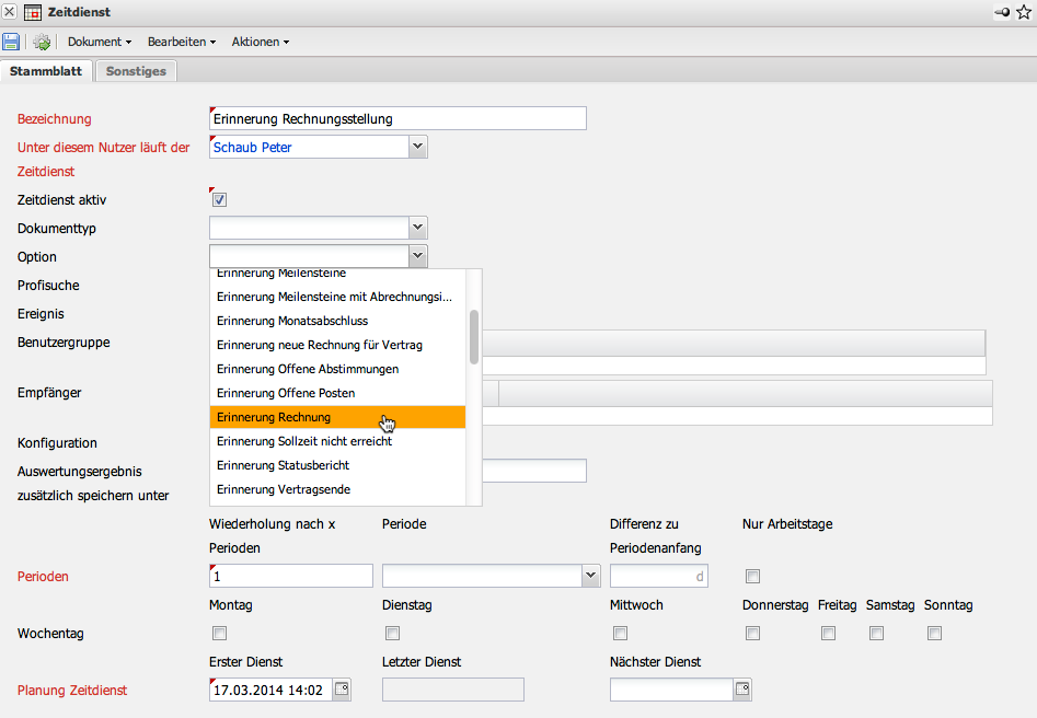 Im Beispiel wird die Option “Erinnerung Rechnung” ausgewählt. Dieser Zeitdienst versendet eine Mail, wenn eine vorkonfigurierte Rechnung (beispielsweise aus Verträgen) zur Rechnungsstellung fällig ist.