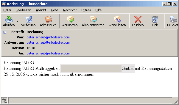 10 Erinnerung neue Rechnung für Vertrag Dieser Zeitdienst überprüft alle Verträge, deren Zeitraum den aktuellen Tag beinhaltet; wenn bei dem Vertrag keine Rechnung eingetragen ist, die ebenfalls den aktuellen Tag beinhaltet, so wird eine Mail an die eingetragenen Empfänger geschickt.