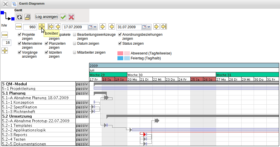 Das System verschiebt nach der Vorwärtsrechnung des Beispiels das Projektende vom 03.03.2011 auf den 31.07.2009. Die Ergebnisse der Berechnung (hier werden keine Mitarbeiterdaten berücksichtigt) werden direkt im Gantt-Diagramm angezeigt. Es ergibt sich aus der Rechnung dann folgender Zustand des Projektplans: