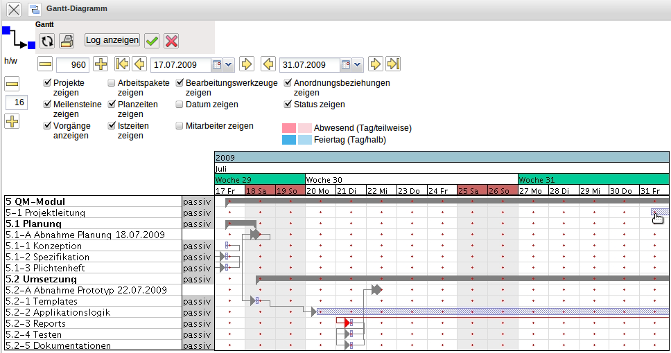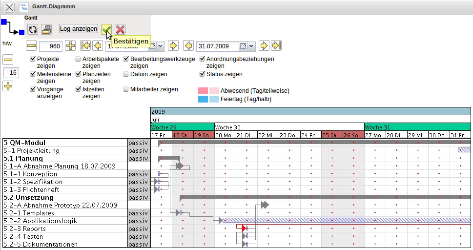 Für das nächste Beispiel werden die Zeiten aller Projektelemente auf das Intervall 17.07.2009 bis 25.08.2009 gesetzt. Mit der Bestätigung des grünen Hakens wird das Datum geändert …