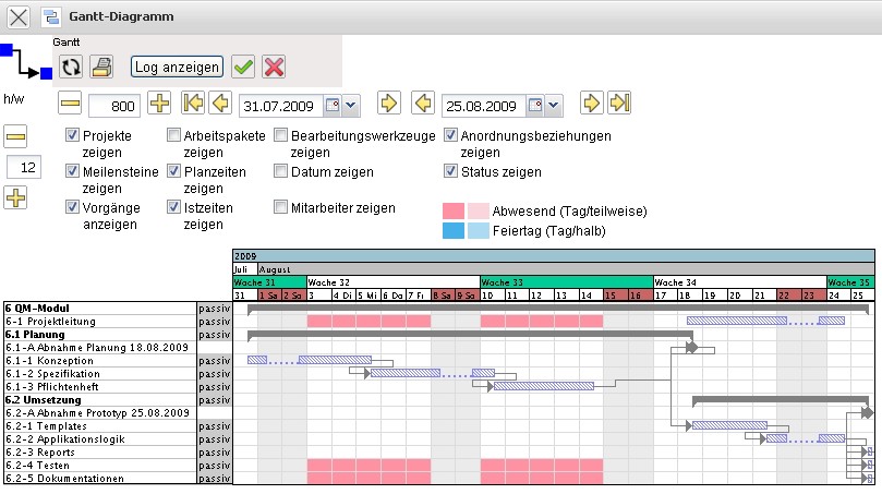 Das Gantt-Diagramm in der Projektplanung beinhaltet zahlreiche Optionen. Im oberen Bereich stehen beispielsweise die Reload-Funktion, der Druck-Modus und das Ereignis-Log zur Verfügung.