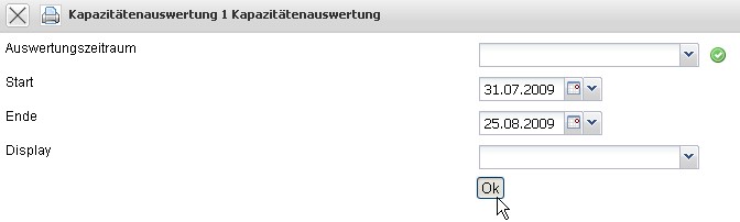 Nach Auswahl einer Auswertung, hier die Auslastungsübersicht III, wird ein Zwischendialog geöffnet, der …