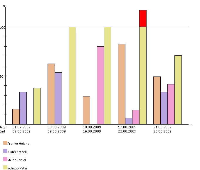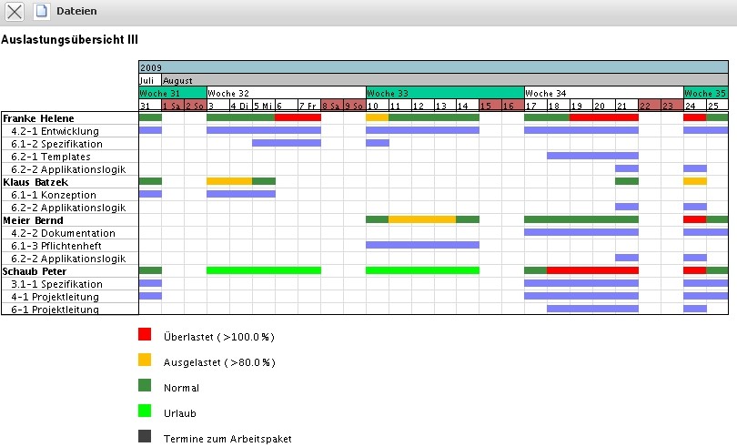 Diese Auswertung generiert mitarbeiterbezogen eine Übersicht über alle Aufgaben der Mitarbeiter und ordnet diese gemäß ihrer Planzeiträume an. In der ersten Zeile der Mitarbeiter sind dabei die Auslastungen der Mitarbeiter in drei Kategorien (rot - überlastet, gelb - ausgelastet und grün - normale Auslastung) dargestellt. Die Schwellwerte können vom Benutzer (obere Auslastungsgrenze und untere Auslastungsgrenze) eingestellt werden. Darüber hinaus enthält die erste Zeile pro Mitarbeiter auch die geplanten Abwesenheiten (im Beispiel Urlaub).