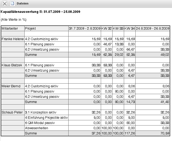 Die Kapazitätenauswertung II generiert mitarbeiterbezogen eine Übersicht über alle geplanten Aufgaben der Mitarbeiter für beliebige Perioden im Betrachtungszeitraum.