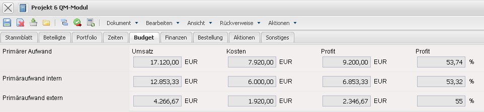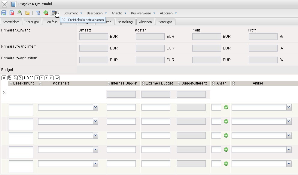 und die Planaufwände werden kumuliert aufgelistet. Im Reiter “Budget” können mit Hilfe der Aktion “Preistabelle aktualisieren” die Budgets aus den Arbeitspaketen berechnet werden, dabei unterscheidet das System zwischen festangestellten Mitarbeitern (intern) und Freelancern und externen Mitarbeitern (extern).