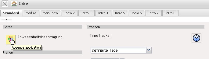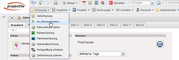 Anmerkung: Die Abwesenheiten können auch im Arbeitsbereich, im Dokumenttyp An/Abwesenheit, oder im TimeTracker erfasst werden.