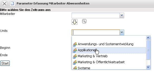 Hier wählt man zunächst die Mitarbeiter (auch mehrere) oder die Unit (alle Mitarbeiter des Standortes oder der Abteilung) und den Zeitraum aus.