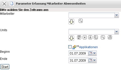 Im Beispiel wird die Anwesenheitserfassung für alle Mitarbeiter der Unit Entwicklung für den Zeitraum 01.07.2009 bis 31.07.2009 geöffnet.