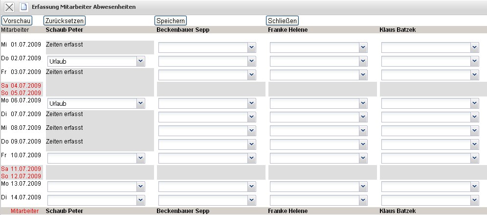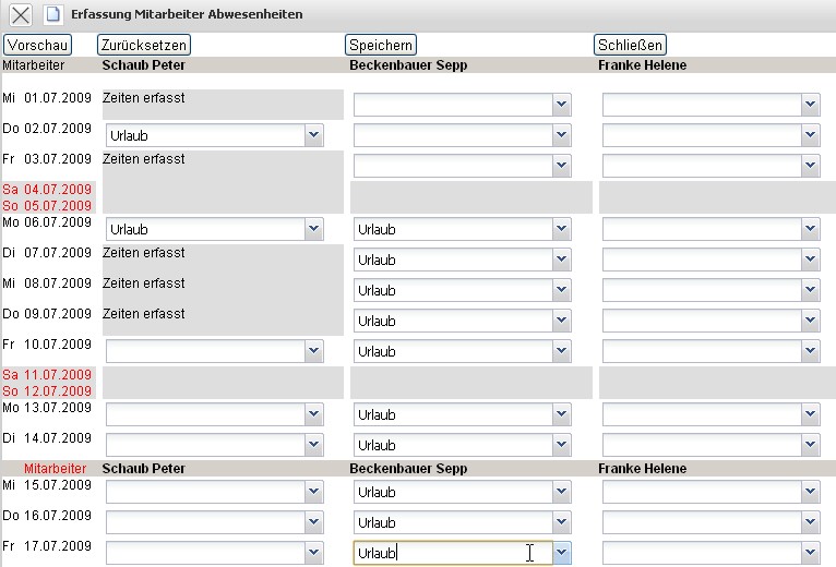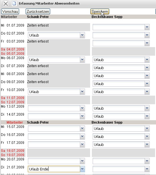 Im Beispiel werden für den Mitarbeiter Sepp Beckenbauer zwei Wochen Urlaub (vom 06.07.2009 bis zum 17.07.2009) definiert.