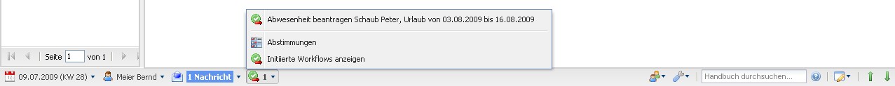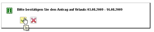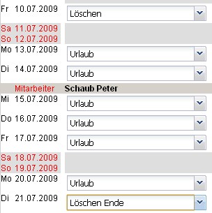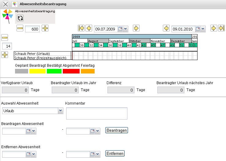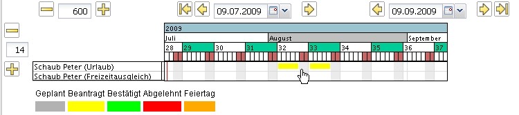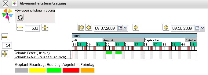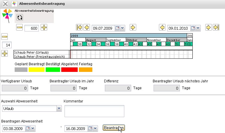 Im folgenden Beispiel wird vom Mitarbeiter Peter Schaub Urlaub vom 03.08.2009 bis zum 16.08.2009 beantragt.