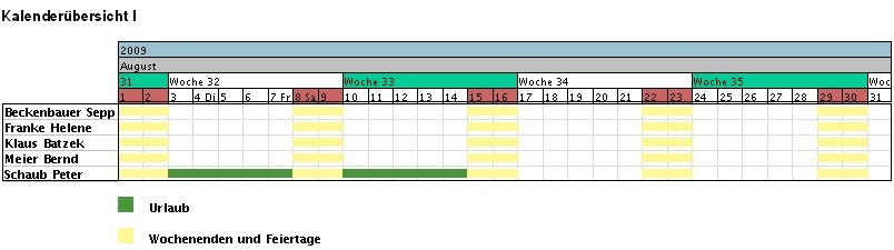 Die Kalenderübersichten zeigen die An- und Abwesenheiten ausgewählter Mitarbeiter über frei definierbare Zeiträume an (siehe auch Auswertungssystem).