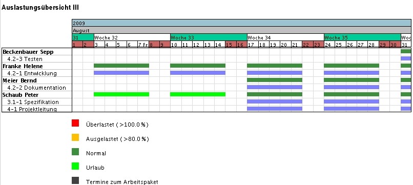 Anmerkung: Die Abwesenheiten im System sind die Grundlage für das gesamte Ressourcenmanagement. Bei allen Ressourcenauswertungen (hier Auslastungsübersicht III) und Vorschlägen wird die geplante Abwesenheit der Mitarbeiter berücksichtigt.