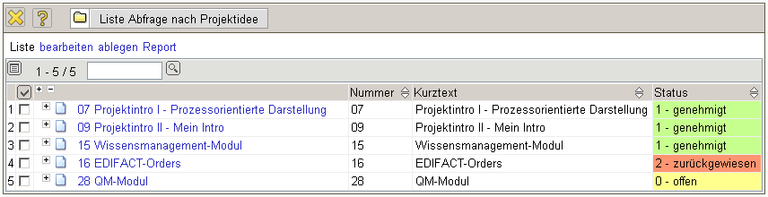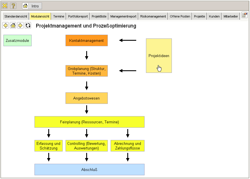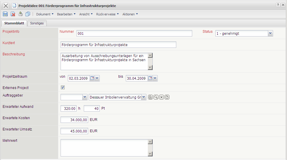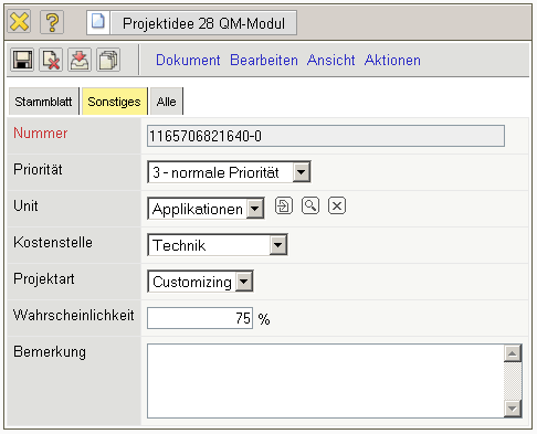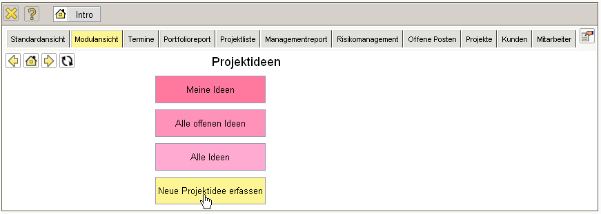 Die Maske Projektidee verwaltet die Ideen als Vorstufe der Projekte.