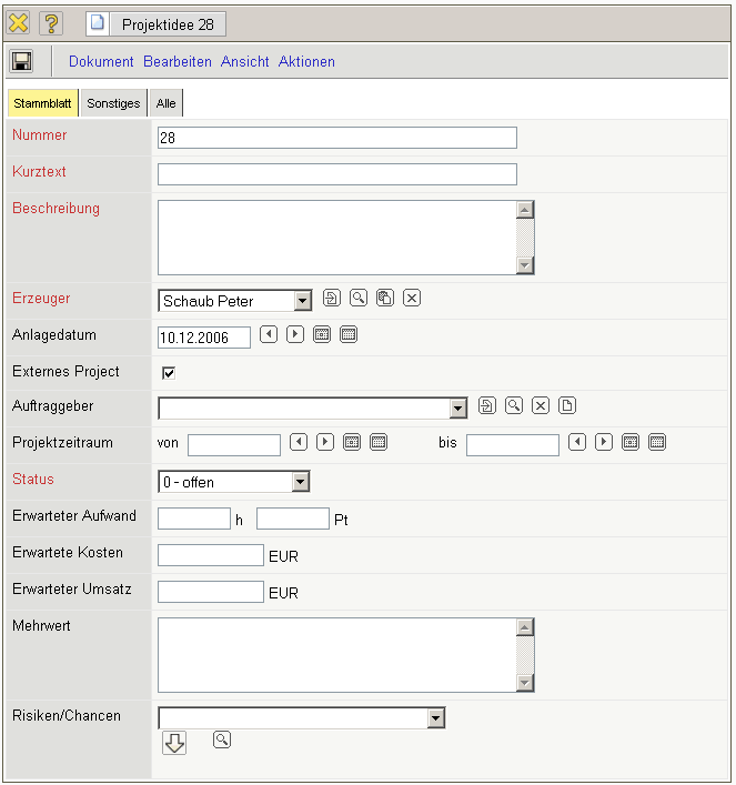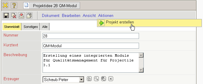 • Erzeuger: Wird vorbelegt mit dem Mitarbeiter, der die Projektidee anlegt