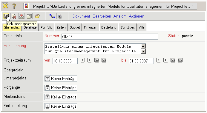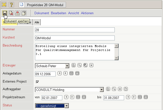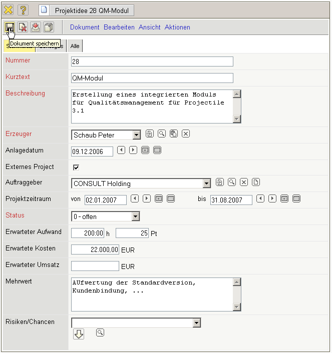Im folgenden Beispiel wird als Idee die Erstellung eines Qualitätsmanagement-Moduls als Projektidee definiert. Das spätere externe Projekt soll für die CONSULT Holding vom 02.01.2007 bis zum 31.08.2007 durchgeführt werden. Der Status der Idee ist offen. Weitere Informationen zur Idee sollen bei der Entscheidungsfindung unterstützen (erwarteter Aufwand, erwartete Kosten, Mehrwert, Risiken/Chancen) und …