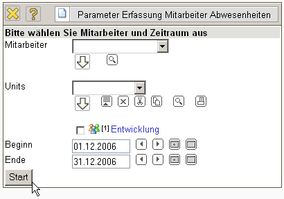 Im Beispiel wird die Anwesenheitserfassung für die alle Mitarbeiter der Unit Entwicklung für den Zeitraum 01.12.2006 bis 31.12.2006 geöffnet.