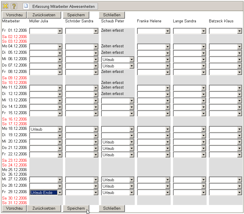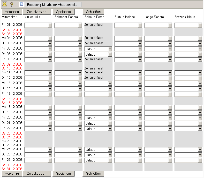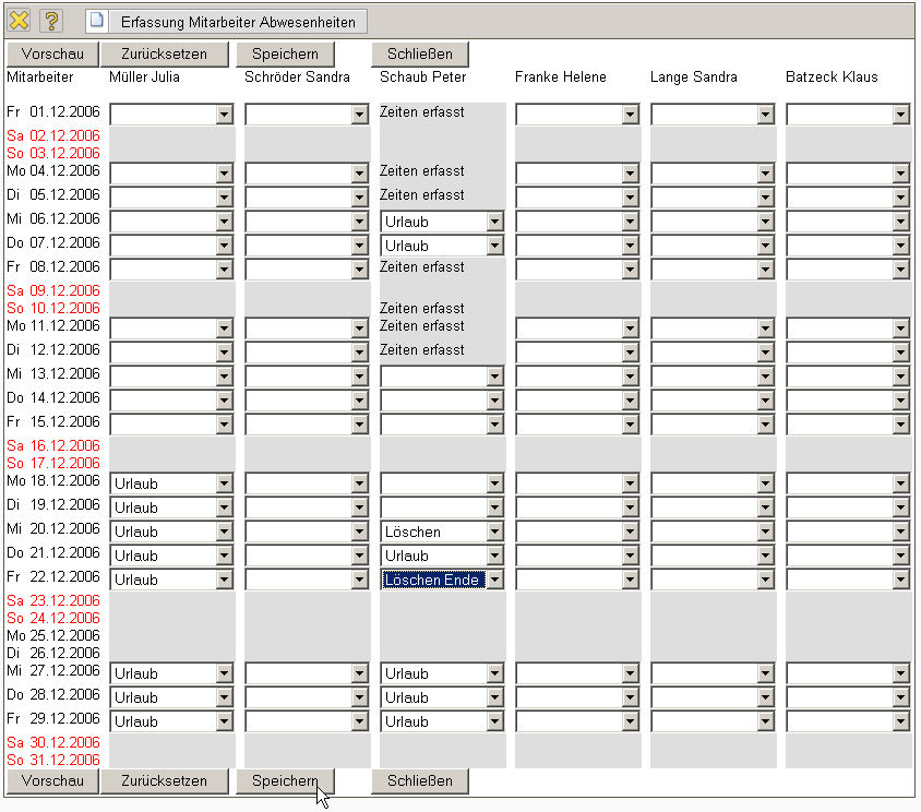 Im zweiten Beispiel wird beim Mitarbeiter Peter Schaub der Urlaub vom 20.12.2006 bis 22.12.2006 …