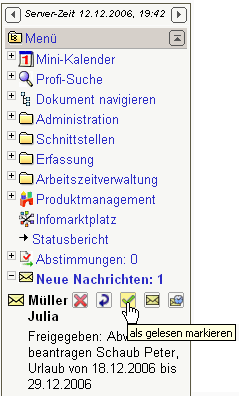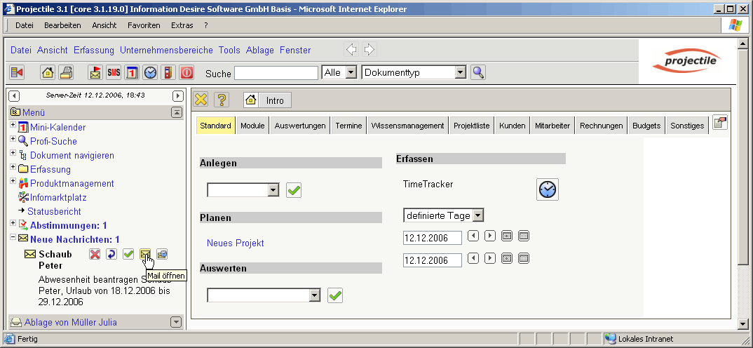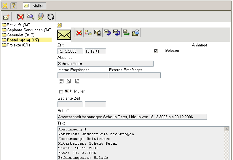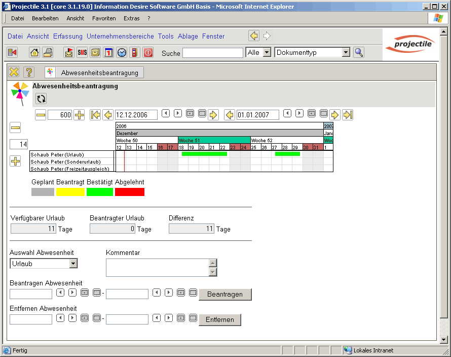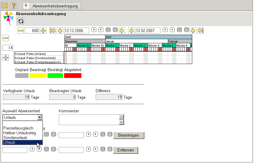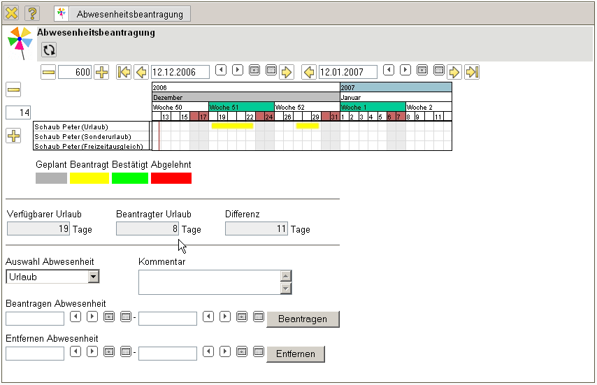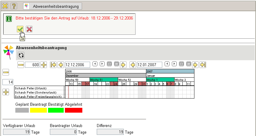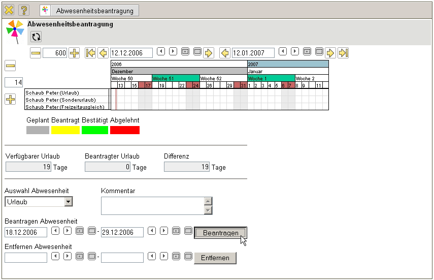 Im folgenden Beispiel wird vom Mitarbeiter Peter Schaub Urlaub vom 18.12.2006 bis zum 29.12.2006 beantragt.