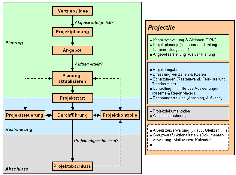 Die Abbildung 1 veranschaulicht die unterstützen Prozesse innerhalb der Projekt­abwicklung mit Projectile: