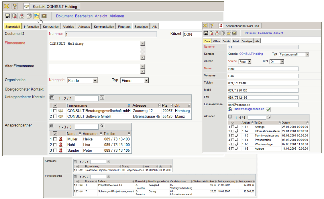 Bei den Kontaktdaten besteht die Möglichkeit, für die einzelnen Kontakte frei definierbare Kategorien zu vergeben (Kunden, Lieferanten, Interessenten, Partner, interne Abteilungen etc.) und eine beliebige Anzahl an Ansprechpartnern zu definieren. In den Aktionen kann die komplette Kontakthistorie zu einem Ansprechpartner protokolliert werden (Telefonate, schriftliche Korrespondenz, Wiedervorlagen, …).