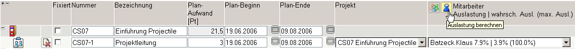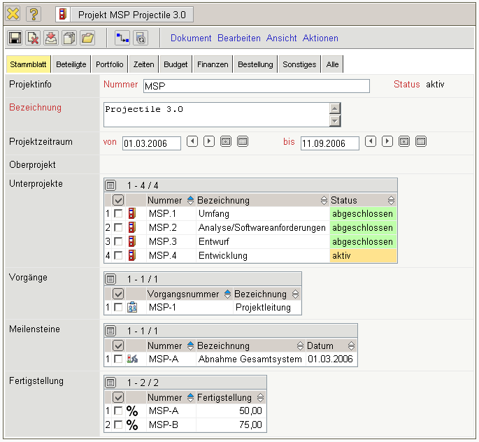 In der Maske Projekt werden alle projektbezogenen Daten (Projektstruktur, Meilensteine und Anordnungsbeziehungen) und projektbezogene Trendschätzungen (Fertigstellungsgrade, Trendtermine) verwaltet.