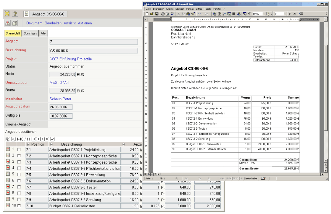 Nach der Definition eines Projektes erhalten Sie im Fakturamodul die Möglichkeit, aus den Plandaten der Projektstruktur und den Daten der Budgetverwaltung, Angebote zu erzeugen. Die Angebote werden aus den definierten Projektdaten (Aufwandsschätzung und Budgets) für den entsprechenden Kunden kalkuliert. Die einzelnen Angebotspositionen sind beliebig modifizierbar. Nach der Erstellung können die Angebote ausgedruckt werden (siehe Abbildung 11).